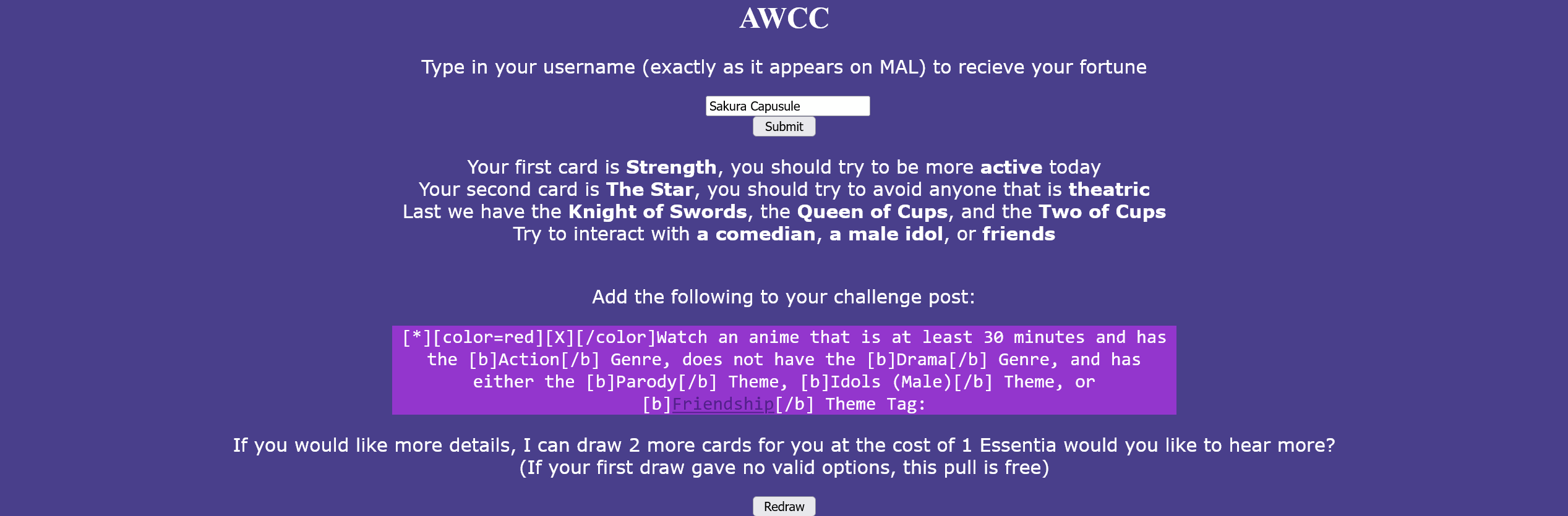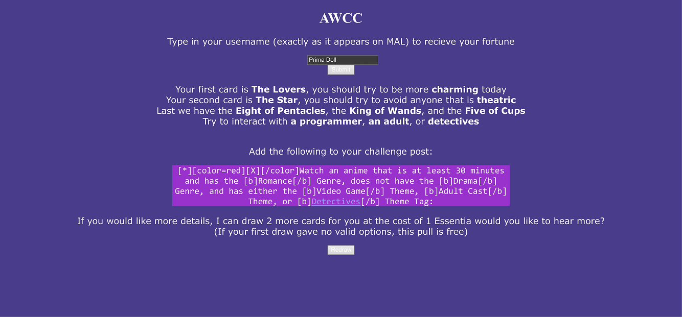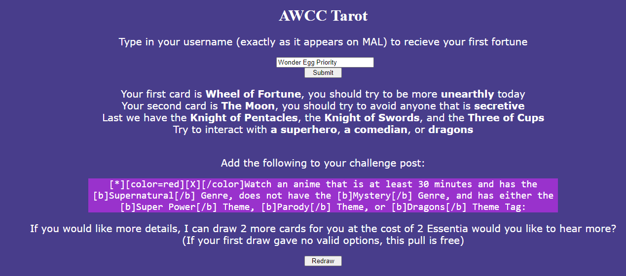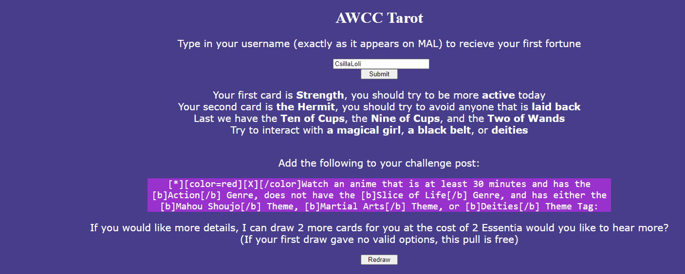 🔒 Types | Cost per item: 4 Essentia🔮 | Unlock the whole category for 30 Essentia🔮 🎰 Slots Machines Path: — Gacha Addict : you may only use MAL genres for matching. ♣ Watching three anime with a single matching genre will award you 10 Essentia. ♣ Watching three anime with two matching genres will award you 15 Essentia. ♣ Watching three anime with three matching genres will award you 20 Essentia. ♣ Watching three anime with four or more matching genres will award you 25 Essentia 🔮 and a Jackpot of 0.50 points. Set 1 x 25 🔮 — Tag(s) : Action, Drama, Horror, Sci-Fi, — Items used : 3, 6, 12 spring, related to another, 90s Ling Long: Incarnation Final Chapter Ling Long: Incarnation Special Blue Seed 2 Set 2 x 25 🔮 — Tag(s) : Action, Comedy, Drama, Mystery — Items used : 1, 8, 13 pg-13, original, 2019 Cike Wu Liuqi Fanwai Cike Wu Liuqi Wu Liuqi: Zui Qiang Fa Xing Shi Set 3 x 20 🔮 — Tag(s) : Adventure, Comedy, Fantasy — Items used : 2, 5, 16 ouija, fall, winter Xian Wang de Richang Shenghuo 3 Xian Wang de Richang Shenghuo 2 Xian Wang de Richang Shenghuo Set 4 x 25 🔮 — Tag(s) : Drama, Horror, Sci-Fi, Suspense — Items used : 4, 14, 15 7+, R, summer Ling Long: Incarnation Ling Long: Incarnation Middle Chapter Ling Long: Incarnation Part 2 Set 5 x 25 🔮 + Jackpot 0.50 pts — Tag(s) : Comedy, Drama, Fantasy, Romance — Items used : 7, 9, 10 00s, stand alone, 2020+ Shin Shirayuki-hime Densetsu Prétear Xie Wang Zhui Qi: Yishi Qingcheng Nishi no Yoki Majo: Astraea Testament ✨ Tarot Corner — site Tarot Cards Starting Date: Nov 01, 2022 Tarot Cards Ending Date: Jan 16, 2023 HoF Comparison between genres/themes ✨ First Chain x 30 🔮 | 0.50 pts