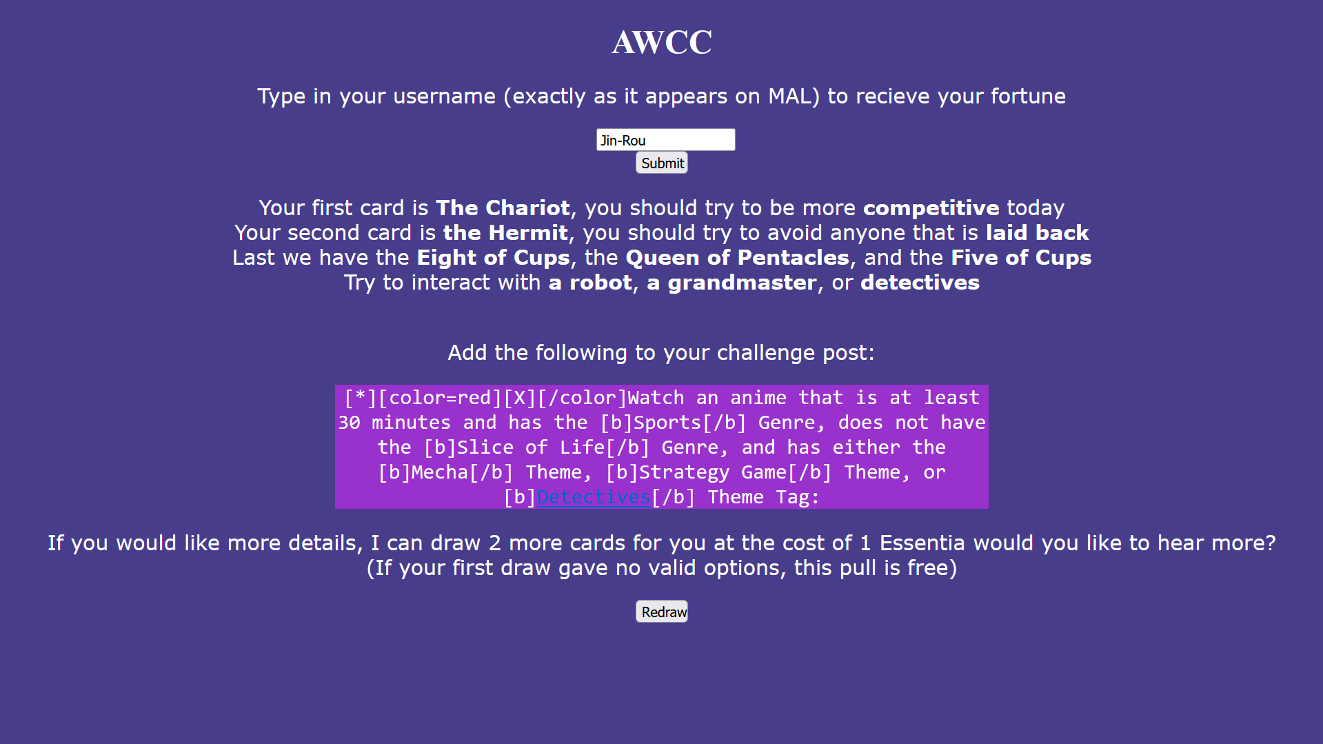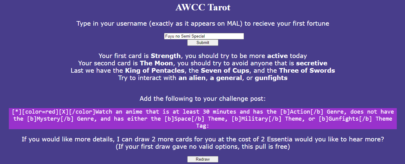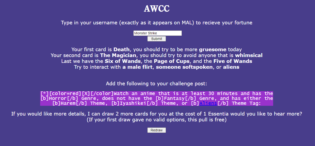 🔒 Types | Cost per item: 4 Essentia🔮 | Unlock the whole category for 30 Essentia🔮 🎰 Slots Machines Path: — Gacha Addict : you may only use MAL genres for matching. ♣ Watching three anime with a single matching genre will award you 10 Essentia. ♣ Watching three anime with two matching genres will award you 15 Essentia. ♣ Watching three anime with three matching genres will award you 20 Essentia. ♣ Watching three anime with four or more matching genres will award you 25 Essentia 🔮 and a Jackpot of 0.50 points. Set 1 x 25 🔮 — Tag(s) : Action, Drama, Horror, Sci-Fi, — Items used : 3, 6, 12 spring, related to another, 90s Ling Long: Incarnation Final Chapter Ling Long: Incarnation Special Blue Seed 2 Set 2 x 25 🔮 — Tag(s) : Action, Comedy, Drama, Mystery — Items used : 1, 8, 13 pg-13, original, 2019 Cike Wu Liuqi Fanwai Cike Wu Liuqi Wu Liuqi: Zui Qiang Fa Xing Shi Set 3 x 20 🔮 — Tag(s) : Adventure, Comedy, Fantasy — Items used : 2, 5, 16 ouija, fall, winter Xian Wang de Richang Shenghuo 3 Xian Wang de Richang Shenghuo 2 Xian Wang de Richang Shenghuo Set 4 x 25 🔮 — Tag(s) : Drama, Horror, Sci-Fi, Suspense — Items used : 4, 14, 15 7+, R, summer Ling Long: Incarnation Ling Long: Incarnation Middle Chapter Ling Long: Incarnation Part 2 Set 5 x 25 🔮 + Jackpot 0.50 pts — Tag(s) : Comedy, Drama, Fantasy, Romance — Items used : 7, 9, 10 00s, stand alone, 2020+ Shin Shirayuki-hime Densetsu Prétear Xie Wang Zhui Qi: Yishi Qingcheng Nishi no Yoki Majo: Astraea Testament ✨ Tarot Corner — site Tarot Cards Starting Date: Nov 01, 2022 Tarot Cards Ending Date: Jan 16, 2023 HoF Comparison between genres/themes ✨ First Chain x 30 🔮 | 0.50 pts
